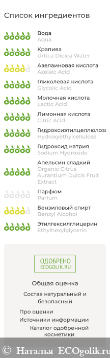 Aqua, Urtica Dioica Water, Azelaic Acid, Glycolic Acid, Lactic Acid, Citric Acid, Hydroxyethylcellulose, Sodium Hydroxide, Organic Citrus Aurantium Dulcis Fruit Extract, Parfum, Benzyl Alcohol, Ethylhexylglycerin.