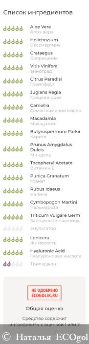 Сайт проверки экоголик не считает данное средство полностью натуральным из-за одного ингредиента. Этот ингридиент не вызвал у меня никаких аллергических реакций, а даже пошел моей коже на пользу
