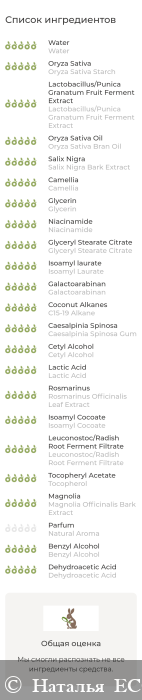 Water (вода), Oryza Sativa (Rice) Starch* (рисовый крахмал), Lactobacillus/Punica Granatum Fruit Ferment Extract* (энзимы граната), Oryza Sativa (Rice) Bran Oil* (масло рисовых отрубей), Salix Nigra (Willow) Bark Extract* (экстракт ивы с салицилатами), Camellia Sasanqua Seed Oil* (масло сасанквы / камелии), Glycerin* (глицерин), Niacinamide (ниацинамид), Glyceryl Stearate Citrate* (глицерил стеарат цитрат), Isoamyl Laurate* (изоамил лаурат), Galactoarabinan* (арабиногалактан), C15-19 Alkane* (кокосовые алканы), Caesalpinia Spinosa Gum* (смола цезальпинии), Cetyl Alcohol* (цетиловый спирт), Lactic Acid* (молочная кислота), Aronia Melanocarpa Fruit Extract* (экстракт ягод аронии черноплодной), Rosmarinus Officinalis (Rosemary) Leaf Extract* (СО2-экстракт листьев розмарина), Isoamyl Cocoate* (изоамил кокоат), Leuconostoc/Radish Root Ferment Filtrate* (консервант из редьки, ферментированной молочнокислыми бактериями), Tocopherol* (токоферол, витамин Е), Magnolia Officinalis Bark Extract* (экстракт коры магнолии), Natural Aroma* (натуральная ароматическая композиция), Benzyl Alcohol (бензиловый спирт), Dehydroacetic Acid (дегидроацетовая кислота).