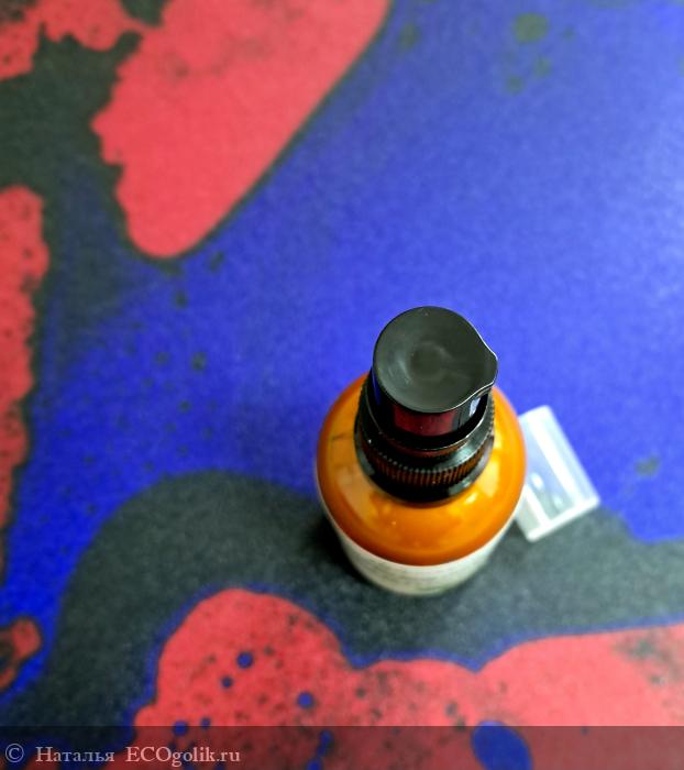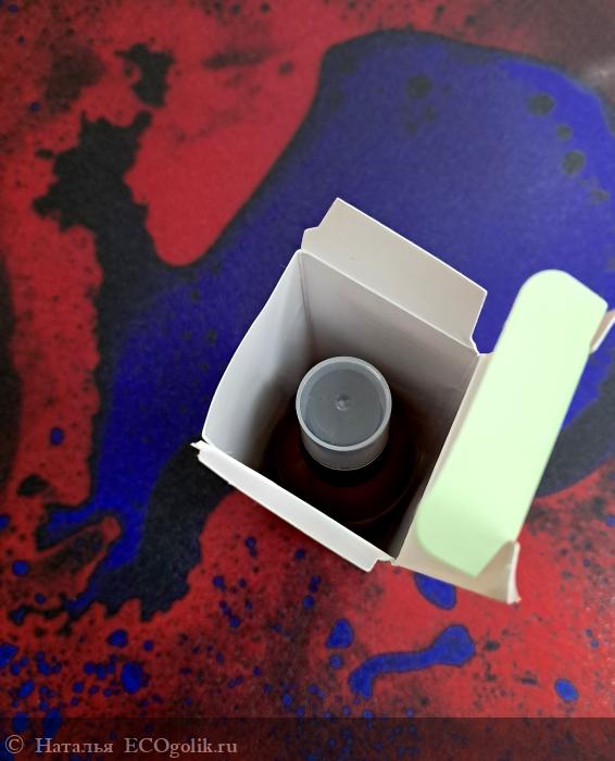 Флакон изготовлен из прочного темного стекла и оснащен дозатором, который имеет дополнительную прозрачную крышку.