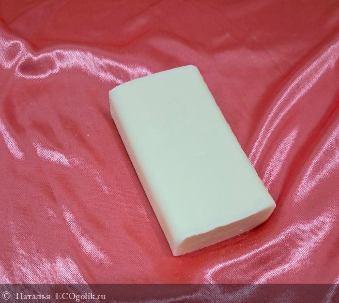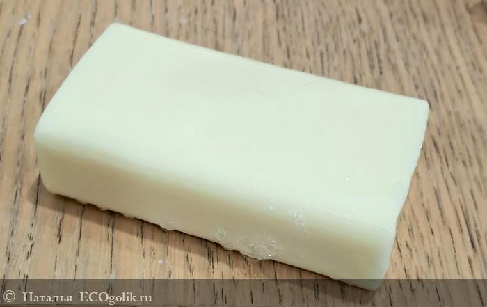 Мыло имеет гладкую, ровную поверхность без видимых дефектов. Форма мыла прямоугольная, что очень удобно для использования. Цвет мыла светло-желтый, ближе к белому, что свидетельствовует о его натуральном составе.
