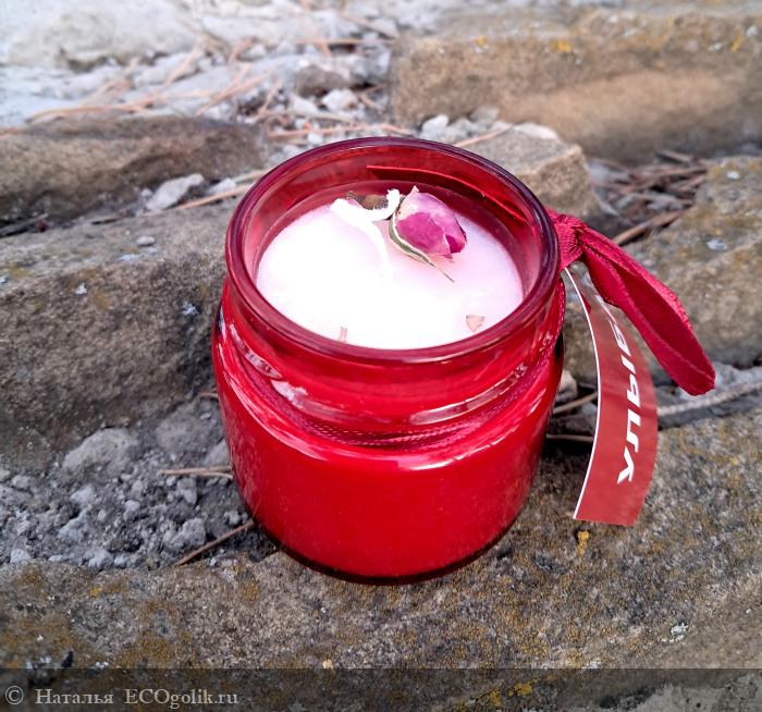 Свеча находится в баночке из прочного стекла. Баночка открывается и закрывается с помощью крышки шайба. Баночка выполнена в красном цвете. Информации на банке немного, самое основное. Там же к баночке красиво прикреплено послание. Выглядит очень стильно и празднично