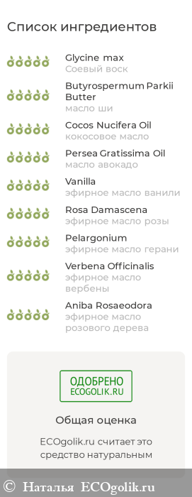 Соевый воск натуральный, масло ши, кокосовое масло, масло авокадо, эфирное масло ванили, эфирное масло розы, эфирное масло герани, эфирное масло вербены, эфирное масло розового дерева.
