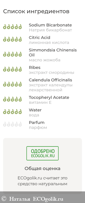 Натрия бикарбонат, лимонная кислота, масло жожоба, экстракт смородины, экстракт календулы лекарственной, витамин Е, вода, парфюм.