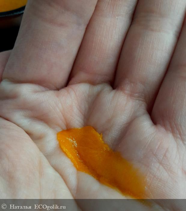 Текстура у VitaМАСКИ маслом довольно интересная – густоватая, насыщенная, прямо как настоящий облепиховый джем! Цвет у нее яркий, оранжевый, что сразу настраивает на позитивный лад. Единственное, запах очень натуральный, облепиховый, довольно интенсивный и может показаться немного навязчивым. В общем, текстура и цвет мне понравились, а вот к запаху нужно привыкнуть