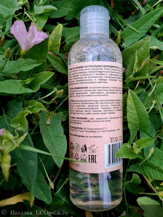 Сразу же бросаются в глаза увлажняющие компоненты. Деионизированная вода – отличная база, а цветочная вода лаванды и гель алоэ вера добавляют успокаивающий и смягчающий эффект. Д-Пантенол и растительный глицерин – это проверенные увлажнители которые помогают коже удерживать влагу.