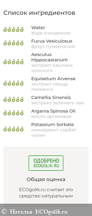 Вода очищенная, фукус пузырчатый, экстракт каштана конского, экстракт хвоща полевого, экстракт зеленого чая, масло аргановое, консервант сорбат калия.