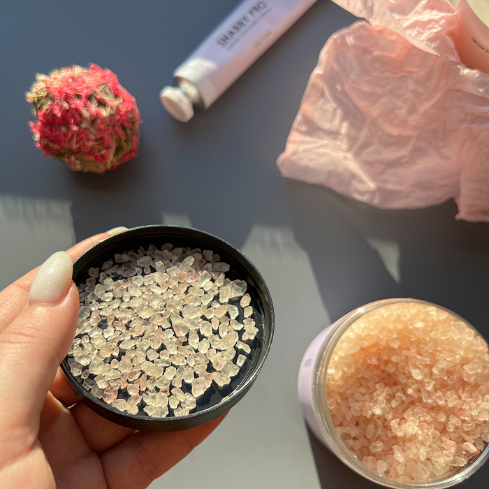 Полупрозрачная соль для ванны с розовыми вкраплениями и ароматом лаванды имеет помол от крупного к среднему. Соль отлично растворяется, не окрашивая кожу/ванну в процессе использования. Аромат очень нежный, успокаивающий и расслабляющий.