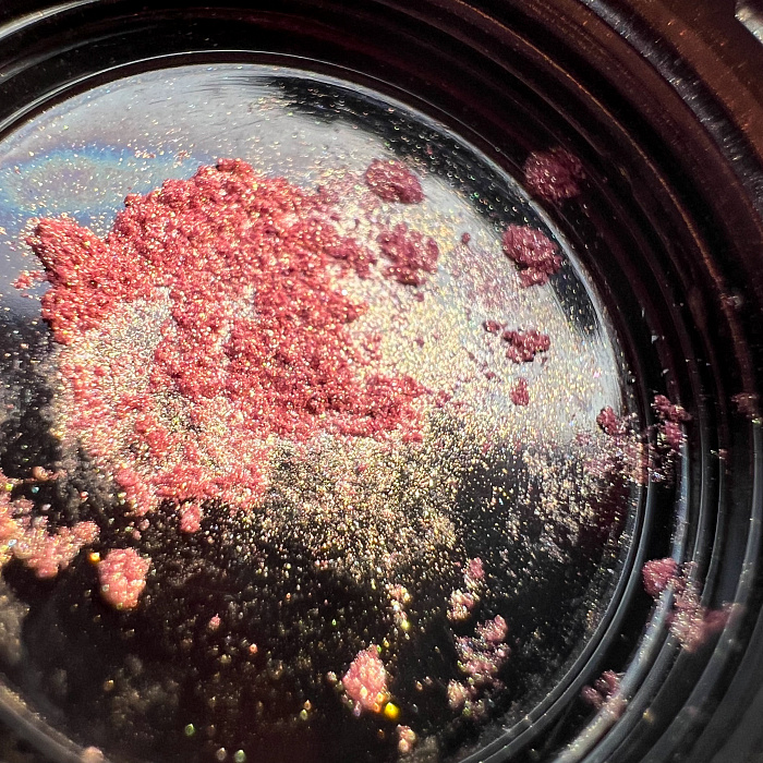 Пигмент "Королевская роль" Р052 - дуохром, у него мелкий помол и сатиновый финиш, он легко набирается на кисть и переносится. На разных подложках может раскрыться от персиково - золотистого до нежно-лилового в зависимости от освещения.