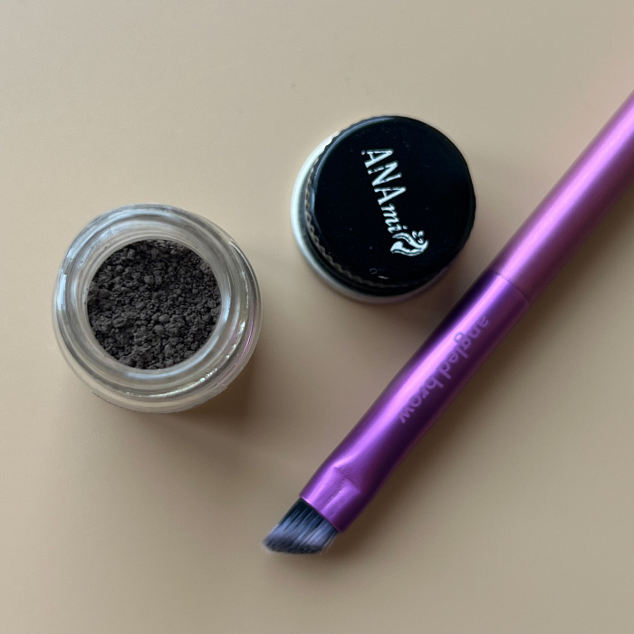Тени в стеклянной баночке с откручивающейся крышкой, оттенок темно-коричневый, матовый. Нравится им оформлять брови. При нанесении дают насыщенный цвет, можно дорисовывать в волосковой технике влажной кистью, держатся весь день.
