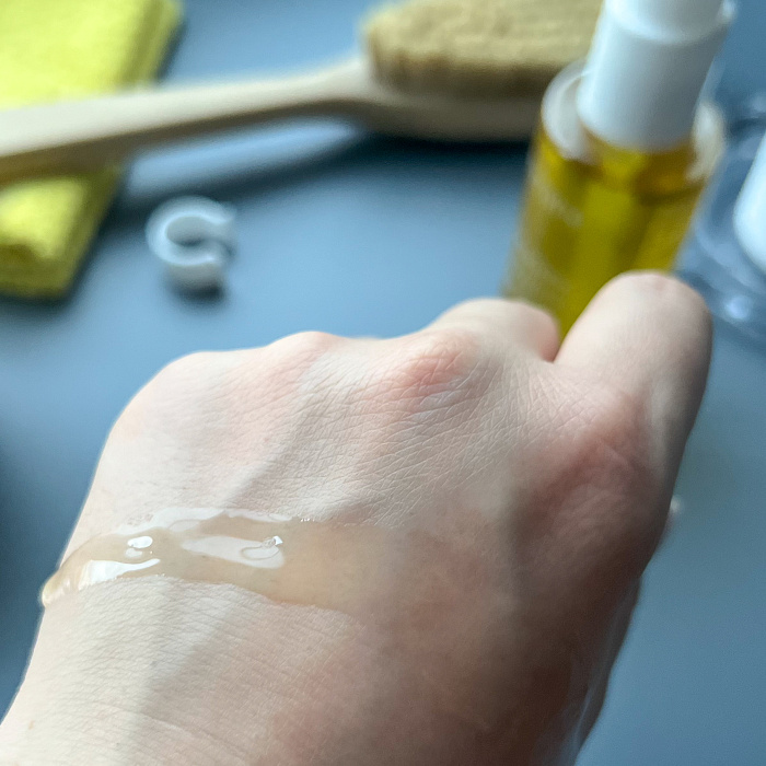 Масло легко подается из флакона, жидкое по текстуре, прозрачное (хотя в баночке яркое золотистое). При контакте с водой становится молочком. Нежно очищает, устраняя сухость, делает кожу мягкой и вкусно пахнет сладким миндалем.