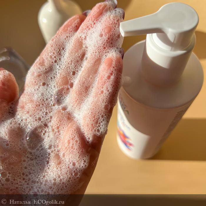 Органолептика хорошая - гель прозрачного цвета, не жидкий как вода. Отлично пенится при намыливании просто руками и дает более пышную пену при мытье губкой. Легко смывается и не сушит кожу. А как же классно пахнет сладкой жевачкой из детства