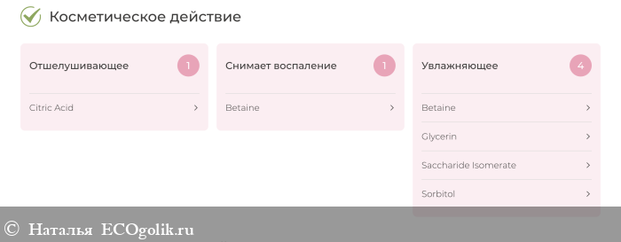 Основное косметическое действие (по результату расширенной проверки PLUS) направлено на увлажнение за счет таких компонентов как бетаин, глицерин, сорбитол и изомерат сахарида: