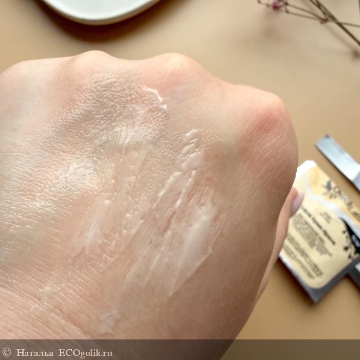 Цвет молочный, текстура средней плотности. Наносила тонким слоем на влажную кожу лица после тоника - легко распределяется, пахнет приятно легким сливочным ароматом. Впитывается не сразу, нужно подождать пару минут.