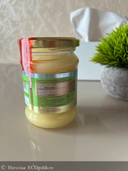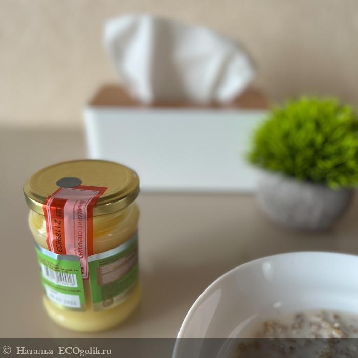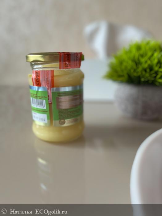 Защита от вскрытия - яркая красная наклейка, при открывании крышки она разрывается и это невозможно не заметить. Масло в баночке имеет золотистый цвет и плотную текстуру, однако оно может стать и жидким если оставить при комнатной температуре (храню на нижней полке холодильника).