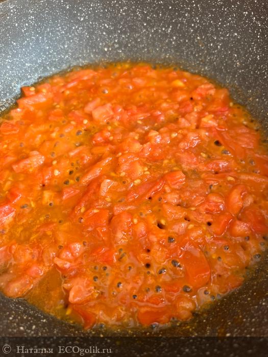 После того, как помидоры дали сок, аккуратно тонкой струйкой вливаю яйца и немного солю. Готовлю на огне пару минут, не закрывая крышкой. В процессе блюдо не пригорает и легко со сковороды снимается.