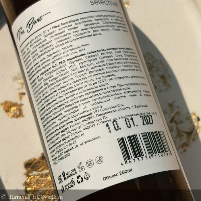 Парфюмированный крем-спрей для волос 30в1 FLEUR NARCOTIQUE от бренда The Bunt подойдет для всех типов волос. Он заменяет несколько уходовых продуктов, моментально преображая волосы. Объем 250мл, после вскрытия годен 3 мес. Производство - г Пенза. Спрей в затемненном пластиковом флаконе с приятным оформлением. С обратной стороны на этикетке есть вся потребительская информация: