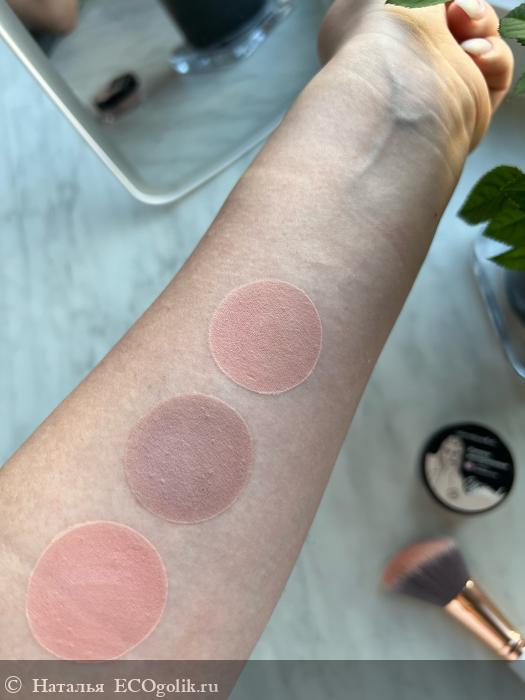 самый верхний свотч - это цвет из баночки, так он раскрывается на моей бледной коже; по середине - данные румяна + сухой скульптор другого бренда; самый нижний оттенок - данные румяна + персиковые румяна другого бренда.