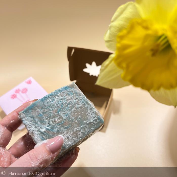 Эти бежево-голубые переходы результат креативного метода заливки, который характерен для мыла ручной работы, поэтому каждый кусочек уникальный.