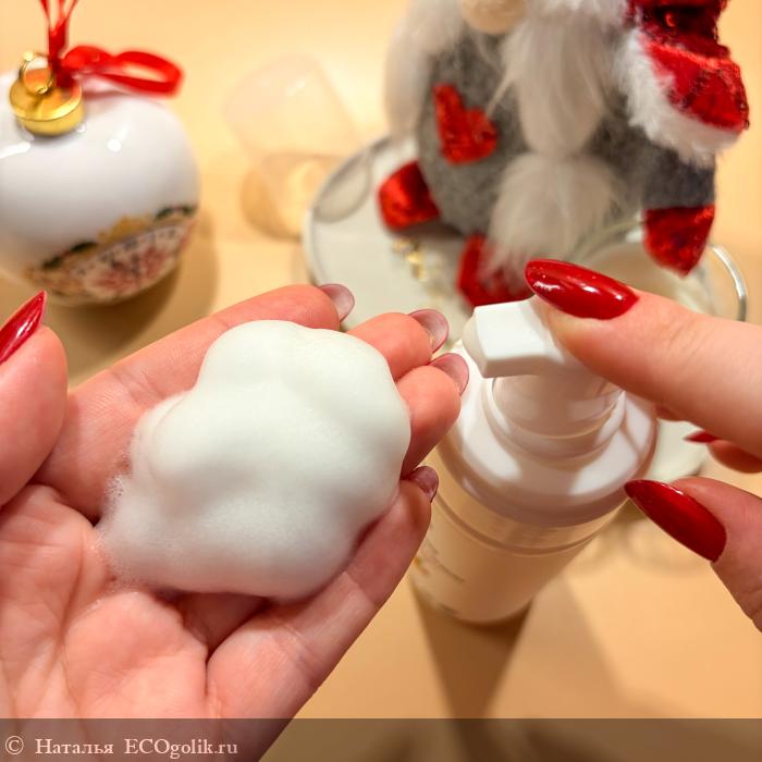 Эргономичный флакон с дозатором позволяет легко и равномерно распределить пенку, образуя воздушную текстуру, которая деликатно очищает кожу, обеспечивая высокий уровень гигиены и снижая риск раздражений. Продукт обладает приятным едва уловимым легким цветочным ароматом, что способствует дополнительному комфорту при использовании.