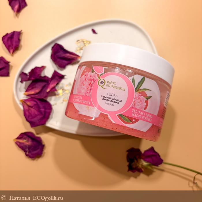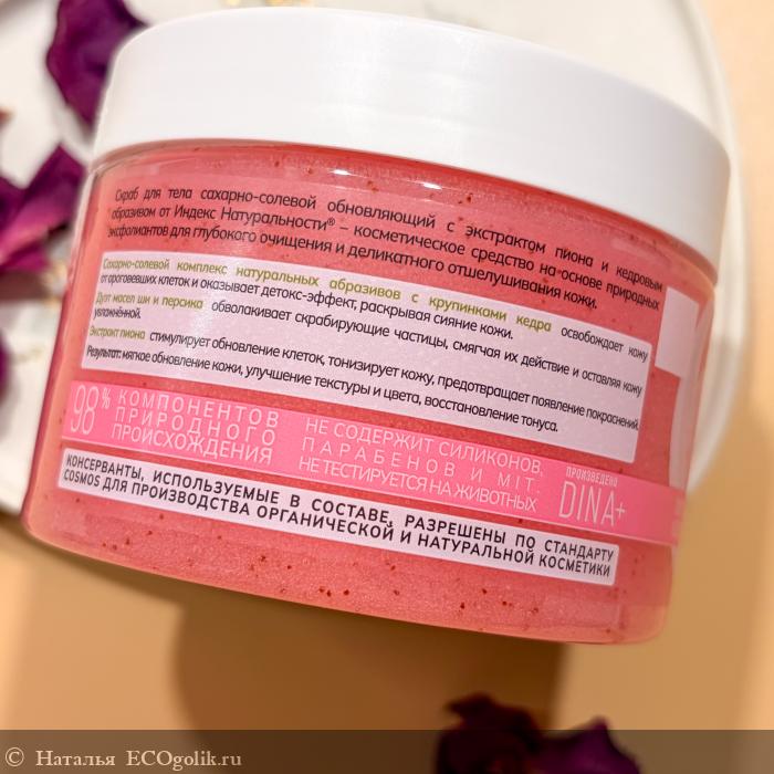 . Недавно появилась линейка с пионом и среди средств по уходу за телом представлен "Сахарно-солевой обновляющий скраб для тела с экстрактом пиона" .
