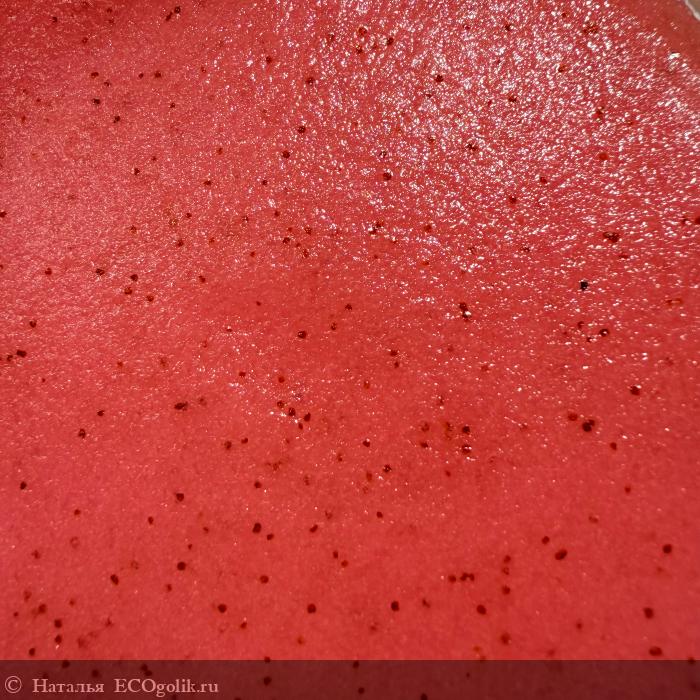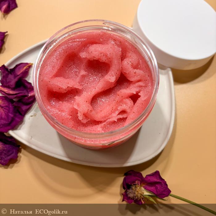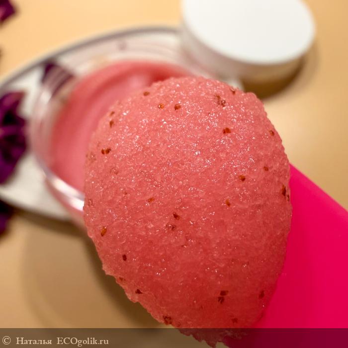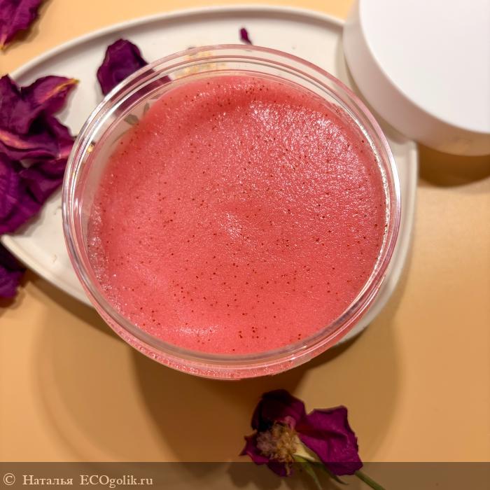 Очень красивый и нежный розово-красный оттенок скраба с вкраплениями полюбился мне с первого взгляда: