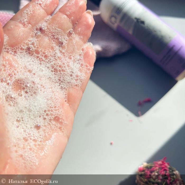 Наношу шампунь на корни, а уже получившейся пеной мою полотно волоса; он легко смывается теплой водой. Всегда процедуру делаю два раза. Средство прекрасно мягко пенится и равномерно распределяется благодаря своей текстуре. При втором намыливании получается объёмная "шапка".