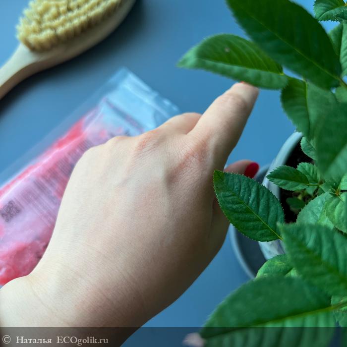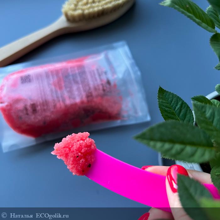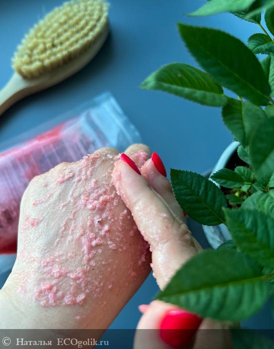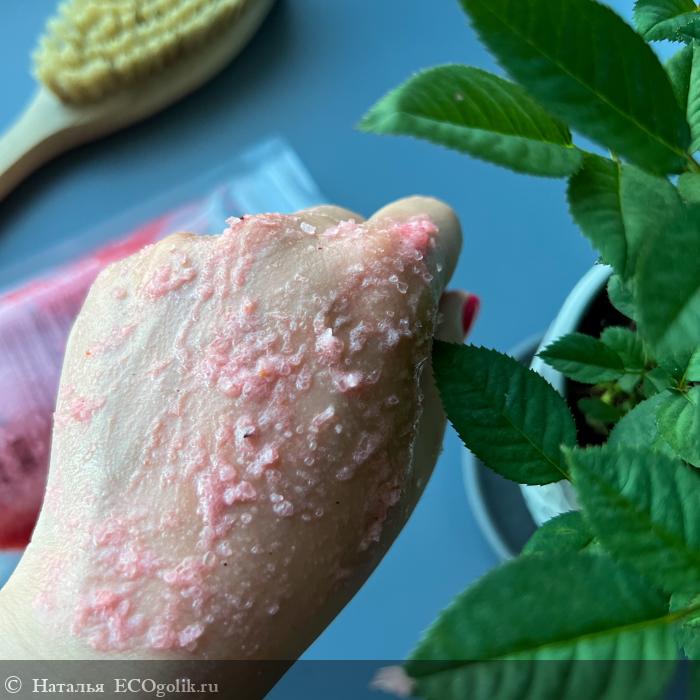 Летний скраб ягодного цвета на основе соли с добавлением масел и косточек земляники понравился: