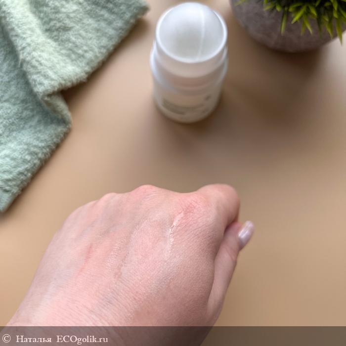 Применение: встряхнуть флакон, 2−3 раза провести шариком по сухой и чистой коже подмышек, дать высохнуть. У дезодоранта приятный аромат зеленого чая, текстура прозрачная. При использовании придерживаюсь рекомендаций производителя, то есть 2-3 раза провожу роллером по коже и через минутку всё впитывается в кожу. Если нанести много - будет липкость в области подмышек.
