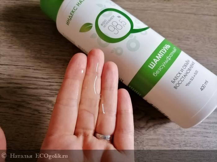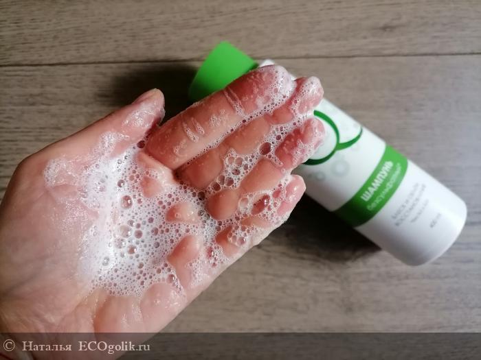 "Безсульфатный Шампунь обладает отличным и мягким пенообразованием, который обеспечивается комплексом на основе солодового экстракта и ПАВов на кокосовом / пальмовом масле и глюкозе. Придаёт объём, обеспечивает расчесывание волос без применения кондиционера".