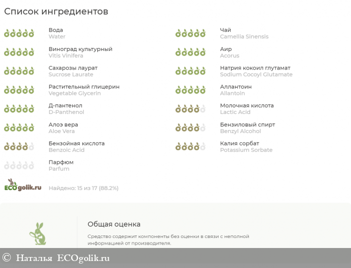 В разрезе того, что продукт обязательно смывать не вижу смысла так же разбирать ингредиенты которые не нашел сервис проверки. В целом состав очень хорош, хотя снятие макияжа происходит не за счет мицелл, а за счет мягких ПАВ.