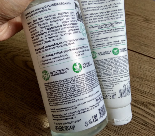 Не знаю,может я и не права,не снимая яблочко за этот факт...но я средствами более,чем довольна.Мыло действительно невероятно бережно и деликатно моет, раз уж мои вечные руки-сухари остались им очень довольны.А крем просто находка для рук требующих постоянного внимания.Он очень быстро впитывается,но руки при этом напитаны влагой и кожа чувствует себя прекрасно.