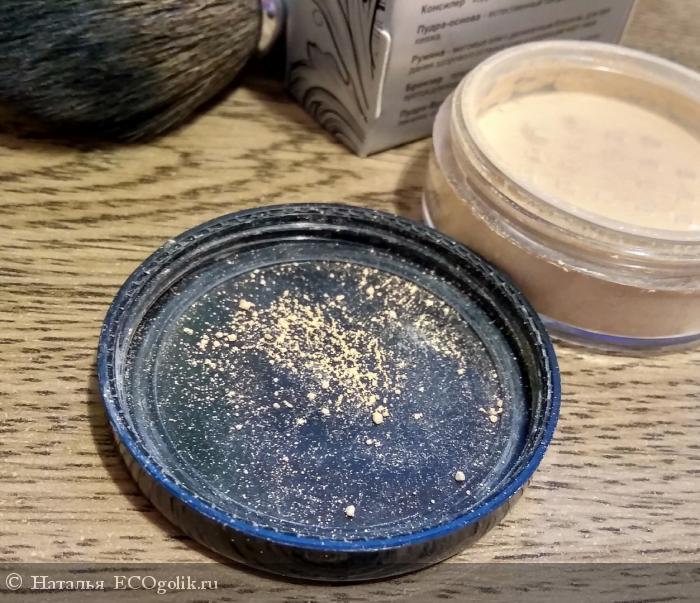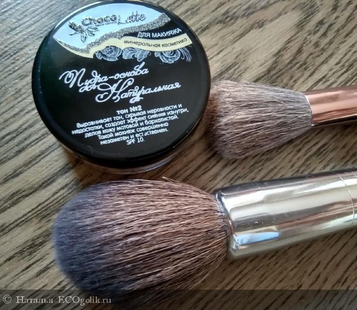Пудра очень мелкого помола,по ощущениям она шелковистая.Применяю я ее именно высыпая в крышечку небольшое ее количество,затем набираю на большую кисть (которая есть на фото) и наношу на лицо.Маленькой кистью мне нанесение показалось не таким естественным,как большой кисточкой.Хотя обе они с натуральным ворсом козы,но у большой ворс гораздо мягче и видимо, за счет этого, нанесение более невесомое.