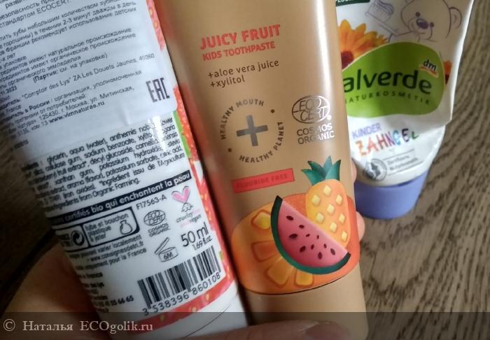 У каждой пасты есть сертификат: ECOCERT у Eco Denta и Coslys,NaTrue у пасты Alverde.