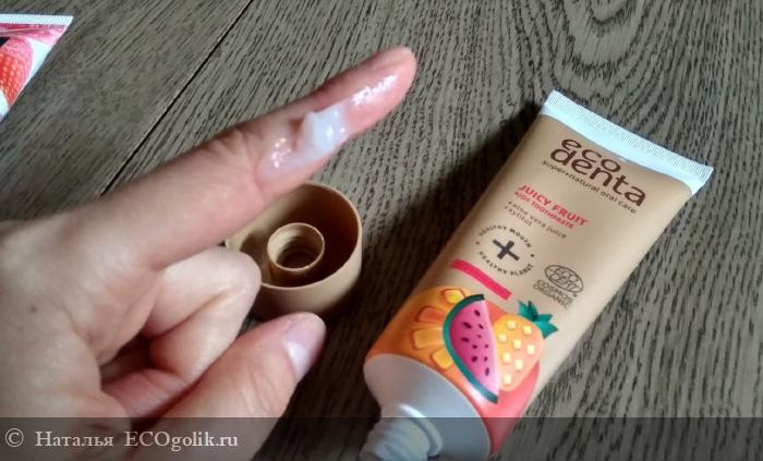 Отдушка пасты сомнений не вызывает,она явно натуральная и пахнет приятно,не химозно.Она очень хорошо пенится,действительно очень деликатно но хорошо очищает зубки.Расход у нее небольшой,хватило нам ее месяцев на 5-6.