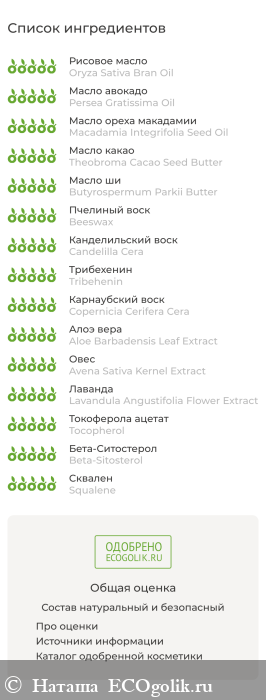 Благодаря тому, что бальзам для губ бесцветный и имеет нейтральный аромат, им можно пользоваться всем членам семьи, что является весомым плюсом при выборе средства. Состав бальзама для губ просто великолепный.