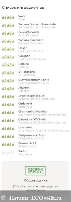 Aqua, Sodium Cocoamphoacetate, Coco-Glucoside, Sodium Gluconate, Hydrolyzed Elastin, Hydrolyzed Collagen, Betaine, D-Panthenol, Butyrospermum Parkii, Allantoin, Argania Spinosa Kernel Oil, Citric Acid, Chamomilla Recutita (Matricaria) Flower Extract , Calendula Officinalis Flower Extract, Lavandula Angustifolia (Lavender) Flower Extract, Dehydroacetic Acid, Benzoic Acid, Fragrance* (пищевая отдушка с гипоаллергенным статусом).