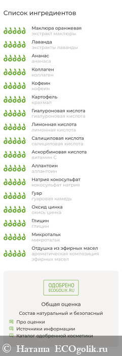 экстракт маклюры, экстракты лаванды, ананаса, коллаген, кофеин, крахмал, гиалуроновая кислота, аскорбиновая кислота, лимонная кислота, салициловая кислота, витамин С, аллантоин, кокосульфат натрия, гуаровая камедь, окись цинка, глицин, микротальк, ароматическая композиция эфирных масел.