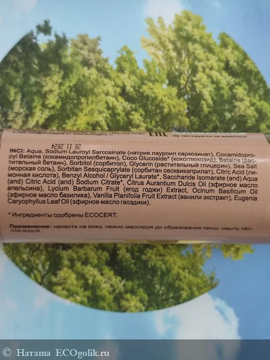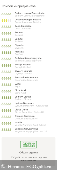 Aqua, Sodium Lauroyl Sarcosinate (натрия лауроил саркозинат), Cocamidopropyl Betaine (кокамидопропилбетаин), Coco Glucoside* (кокоглюкозид), Betaine (растительный бетаин), Sorbitol (сорбитол), Glycerin (растительный глицерин), Sea Salt (морская соль), Sorbitan Sesquicaprylate (сорбитана сесквикаприлат), Citric Acid (лимонная кислота), Benzyl Alcohol / Glyceryl Laurate*,