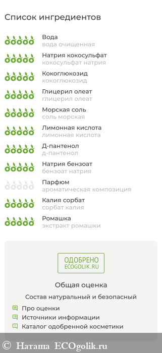 вода очищенная, кокосульфат и кокоглюкозид (натуральные пенные компоненты из растительного сырья), глицерил олеат (натуральный иммуностимулятор кожи), соль морская, лимонная кислота, д-пантенол (провитамин В5), бензоат натрия (пищевой консервант для натуральной косметики), ароматическая композиция, сорбат калия (пищевой консервант для натуральной косметики), экстракт ромашки.