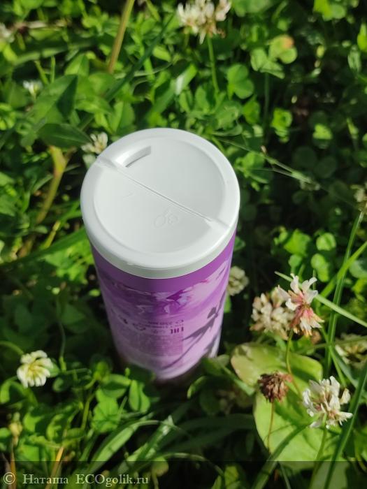 Имеется круговая этикетка, выдержанная в нежном фиолетовом оттенке, радующем взор.