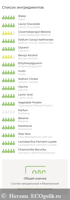 Aqua, Lauryl Glucoside, Cocamidopropyl Betaine, Sodium Cocoyl Isethionate, Glycerin, Benzyl Alcohol, Ethylhexylglycerin, Inulin, Sodium Сitrate, Glycine, Lactic Acid, Hydrolyzed Wheat Protein, Perfume, Betaine, Panthenol, Aloe Barbadensis (Aloe Vera) Leaf Gel, Lactobacillus Ferment Lysate, Chamomilla Recutita Flower Exctract.