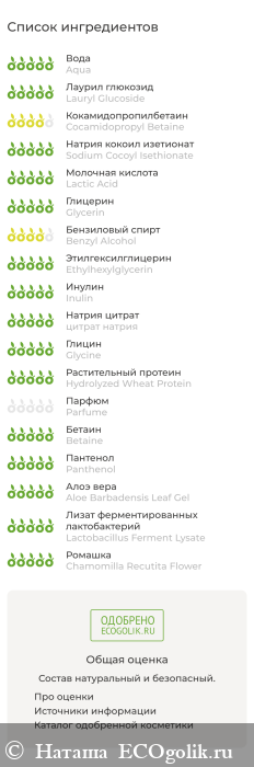 Aqua, Lauryl Glucoside, Cocamidopropyl Betaine, Sodium Cocoyl Isethionate, Lactic Acid, Glycerin, Benzyl Alcohol, Ethylhexylglycerin, Inulin, Sodium Сitrate, Glycine, Hydrolyzed Wheat Protein, Perfume, Betaine, Panthenol, Aloe Barbadensis (Aloe Vera) Leaf Gel, Lactobacillus Ferment Lysate, Chamomilla Recutita Flower Exctract.