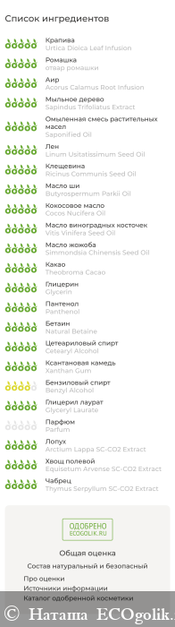 Equisetum Arvense Leaf (хвоща полевого) Infusion, Urtica Dioica Leaf (крапивы) Infusion, Chamomilla Recutita Flower (ромашки) Infusion, Acorus Calamus Root (корня аира) Infusion, Arctium Lappa Root (корня лопуха) Infusion, Linum Usitatissimum Seed (семян льна) Infusion, Sapindus Trifoliatus (мыльного ореха) Extract, Saponified (Coconut) Oil, Saponified (Olive) Oil, Linum Usitatissimum Seed (семян льна) Oil, Arctium Lappa Root (репейное) Oil, Ricinus Communis (Castor) Seed (касторовое) Oil, Butyrospermum Parkii (Shea Butter) (масло ши) Oil, Cocos Nucifera (Coconut) (кокоса) Oil, Vitis Vinifera Seed (виноградной косточки) Oil, Simmondsia Chinensis (Jojoba) Seed (жожоба) Oil, Theobroma Cacao (Powder), Glycerin, Panthenol, Natural Betaine, Cetearyl Alcohol, Xanthan Gum (ксантановая камедь), Benzyl Alcohol (and) Glyceryl Laurate, Parfum, Arctium Lappa (корня лопуха) SC-CO2 Extract, Equisetum Arvense (хвоща полевого) SC-CO2 Extract, Thymus Serpyllum (чабреца) SC-CO2 Extract.