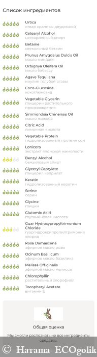 отвар крапивы двудомной, цетеариловый спирт, свекольный бетаин, масло косточек миндаля, масло бабассу, инулин голубой агавы, кокоглюкозид, глицерин растительного происхождения, масло жожоба, лимонная кислота, гидролизованный соевый протеин, экстракт японской жимолости, бензиловый спирт, глицерил каприлат, гидролизованный кератин, карбоксицистеин, серин, глицин (аминоуксусная кислота), глутаминовая кислота, гуаргидроксипропилтримония хлорид, эфирное масло розы, эфирное масло базилика, эфирное масло мелиссы лекарственной, эфирное масло укропа, растительный хлорофилл, витамин Е.