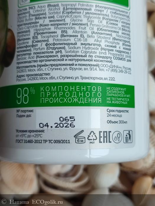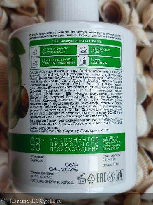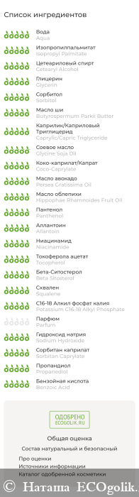 Aqua (Вода), Isopropyl Palmitate (Изопропилпальмитат / эмолент), Cetearyl Alcohol (Цетеариловый спирт / стабилизатор), Glycerin (Глицерин), Sorbitol (Сорбитол / увлажнитель), Butyrospermum Parkii Butter(Масло ши / смягчающий эмолент), Caprylic/Capric Triglyceride (Каприлик / каприк триглицериды / смягчающий эмолент), Glycine Soja Oil (Соевое масло / смягчающий эмолент), Coco-Caprylate (Коко-каприлат / эмолент), Persea Gratissima Oil (Масло авокадо / смягчающий эмолент), Hippophae Rhamnoides Fruit Oil (Облепиховое масло / эмолент), Panthenol (Пантенол), Allantoin (Аллантоин), Niacinamide (Витамин В3), Tocopherol (mixed), Beta Sitosterol, Squalene (Антиоксидант, витаминный комплекс), Potassium C16-18 Alkyl Phosphate (Калия алкилфосфат / фосфолипидный эмульгатор, схожий с кожей человека), Parfum (Отдушка), Sodium Hydroxide (Натрия гидроксид / регулятор показателя pH), Sorbitan Caprylate, Propanediol, Benzoic Acid (Сорбитан каприлат, Пропандиол, Бензойная кислота / консервант, разрешенный по стандарту COSMOS для производства органической косметики).