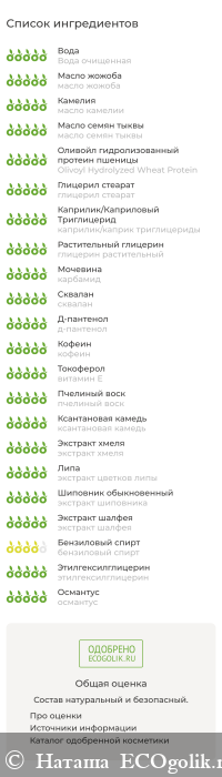 Вода очищенная, комплекс масел жожоба, камелии, семян тыквы, калий оливоил гидролизованный протеин пшеницы и глицерил стеарат (натуральный эмульгатор), каприлик/каприк триглицериды (натуральный смягчитель), глицерин растительный, карбамид (натуральный увлажняющий фактор), сквалан (натуральный смягчитель), д-пантенол (провитамин В5), кофеин (натуральный компонент для упругости), витамин Е, пчелиный воск, ксантановая камедь (натуральный загуститель), СО2-экстракты хмеля, цветков липы, шиповника, шалфея, бензиловый спирт и этилгексилглицерин (консерванты для натуральной косметики), эфирное масло османтуса.