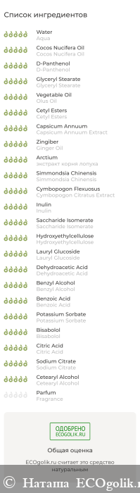 Aqua, Cocos Nucifera Oil, D-Panthenol, Glyceryl Stearate, Olus Oil, Cetyl Esters, Capsicum Annuum Extract, Zingiber Oil, Arctium Extract, Simmondsia Chinensis, Cymbopogon Citratus Extract, Inulin, Saccharide Isomerate, Hydroxyethylcellulose, Lauryl Glucoside, Dehydroacetic Acid, Benzyl Alcohol, Benzoic Acid, Potassium Sorbate, Bisabolol, Citric Acid, Sodium Citrate, Cetearyl Alcohol, Fragrance