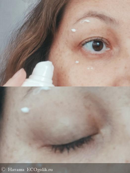 Благодаря тому, что крем хранится в холодильнике, то есть приятный охлаждающий эффект. Кожа век увлажнена и напитана, мелкие морщинки постепенно становятся менее заметными, лифтинг-эффект ощущается, утренняя отечность снимается.