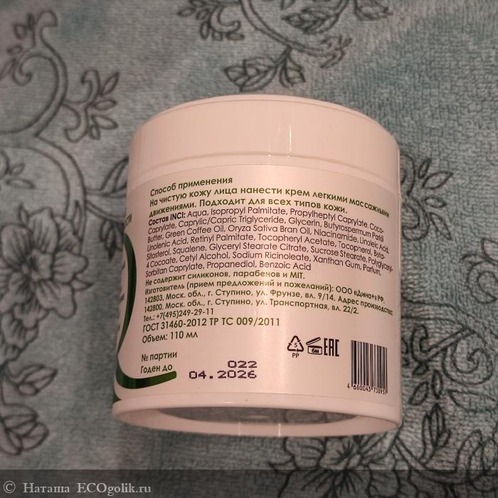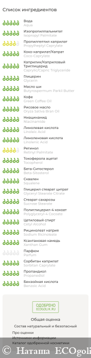 Aqua (Вода), Isopropyl Palmitate (Изопропилпальмитат / эмолент), Propylheptyl Caprylate (Пропилгептил каприлат / эмолент), Coco-Caprylate (Коко каприлат / эмолент), Caprylic/Capric Triglyceride (Каприлик/каприк триглицериды / эмолент), Glycerin (Глицерин), Butyrospermum Parkii Butter (Масло ши), Green Coffee Oil (Масло зелёного кофе), Oryza Sativa Bran Oil (Масло рисовых отрубей), Niacinamide (Витамин В3), Linoleic Acid (and) Linolenic Acid (Витамин F), Retinyl Palmitate (Витамин A), Tocopheryl Acetate (Витамин Е), Tocopherol, Beta-Sitosterol, Squalene (Токоферол, Бета-ситостерол, Сквален / природный антиоксидант), Glyceryl Stearate Citrate, Sucrose Stearate, Polyglyceryl-4 Cocoate, Cetyl Alcohol, Sodium Ricinoleate (Глицерил стеарат цитрат, Стеарат сахарозы, Полиглицерил-4 кокоат, Цетиловый спирт, Рицинолеат натрия / натуральный эмульгатор Dub Base Expert), Xanthan Gum (Ксантановая камедь), Parfum (Отдушка), Sorbitan Caprylate, Propanediol, Benzoic Acid (Сорбитан каприлат, Пропандиол, Бензойная кислота / консервант, разрешенный по стандарту COSMOS для производства органической косметики).